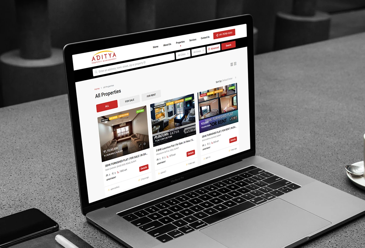 In response to the challenges faced during the real estate website design for Aditya Property Management, we adopted several tailored approaches. We focused on cost-effective real estate web design strategies to align with the client's budget while ensuring premium quality. Property listings were organized, featuring clear categories and filters, simplifying the search experience. The integration of user-friendly search tools was achieved, and we gave special attention to optimizing images to guarantee swift load times. To top it all off, we placed a high emphasis on responsive real estate website design, showcasing our expertise as a top real estate web design agency Surat.